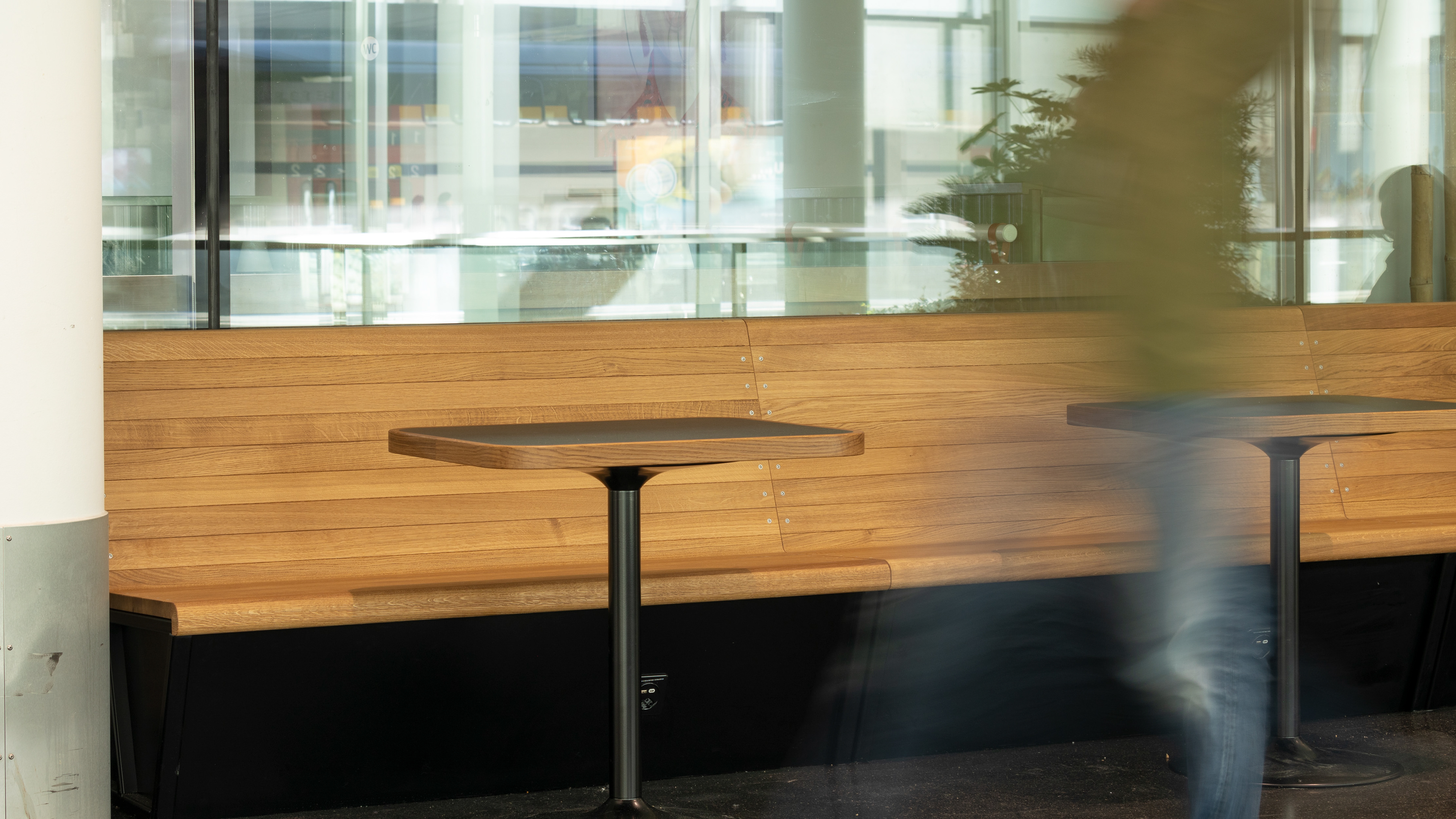MKPHOTO, Architekturfotograf aus Aarau, SBB Bahnhof Aarau, Polstermöbel und Stehtische aus Eichenholz.